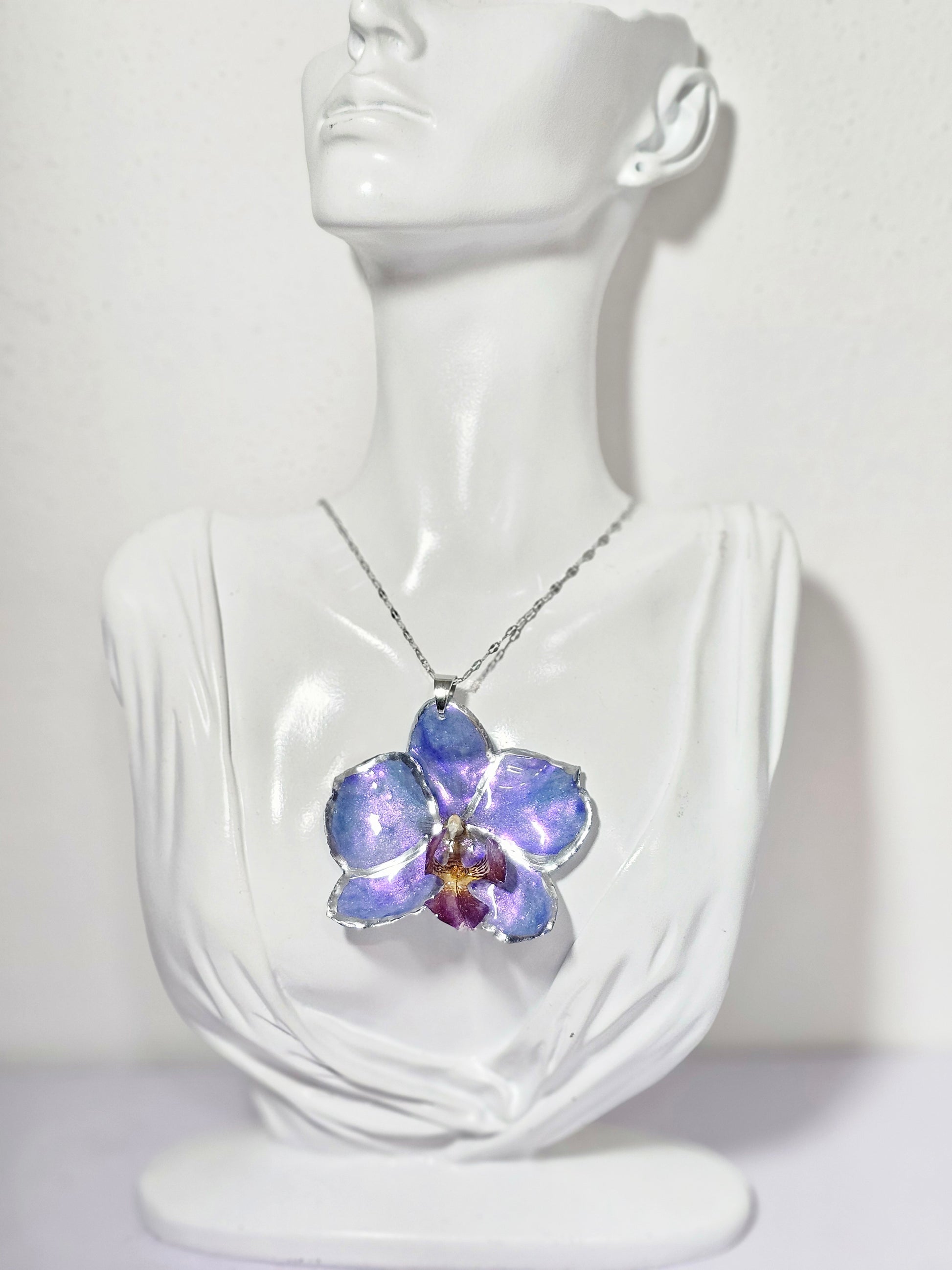 Deja que la naturaleza te acompañe con elegancia 🌿💫 Este collar artesanal presenta una verdadera orquídea natural encapsulada y pintada a mano con delicados destellos tornasol en tonos morado-violeta, resaltando con un fino borde plateado que enmarca su belleza 🌸✨