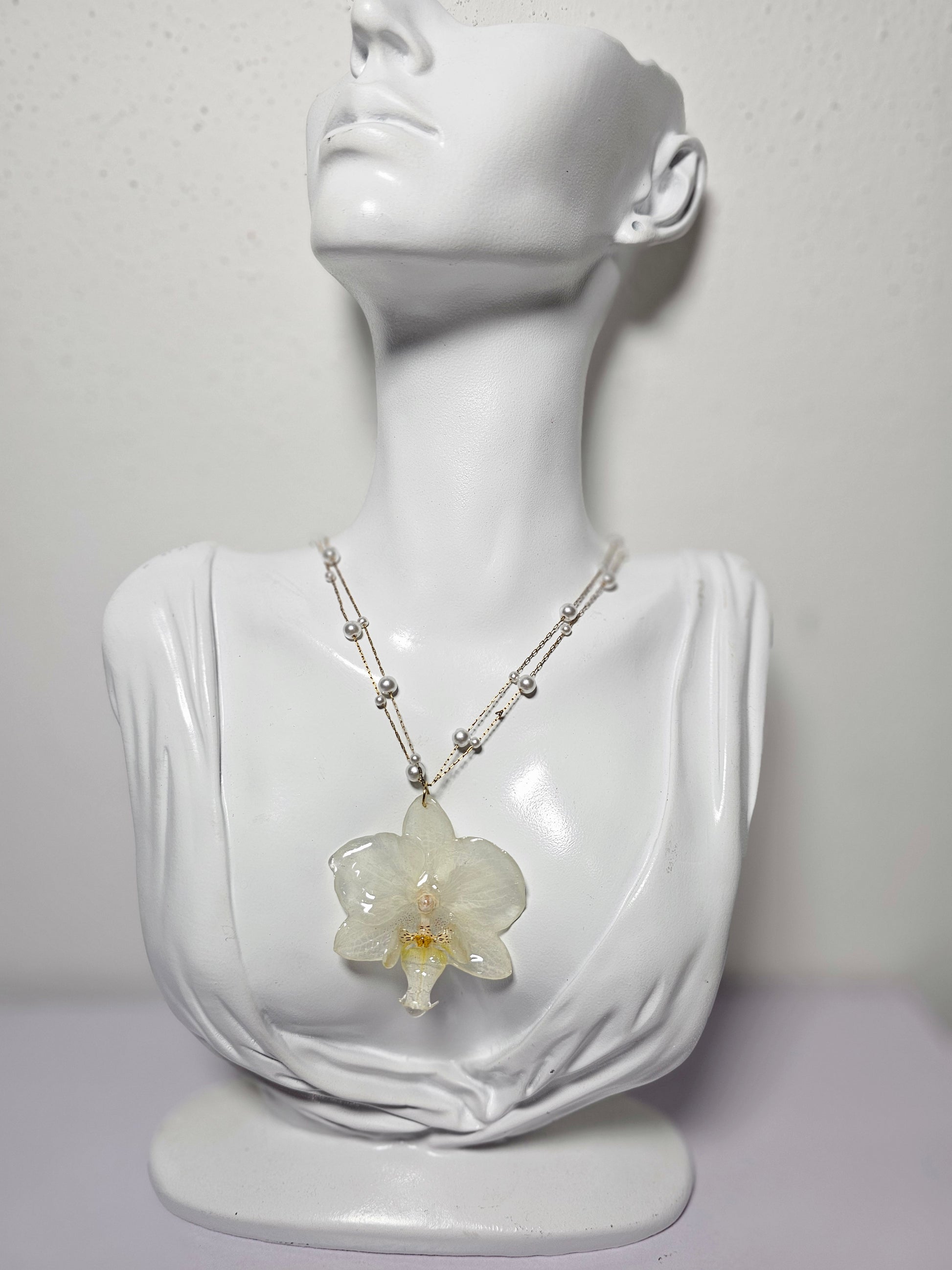 Este collar está elaborado a mano con una mini orquídea blanca natural encapsulada en resina, lo que la convierte en una joya verdaderamente única 🌸. Cada flor mide aproximadamente 4 cm, aunque el tamaño puede variar ligeramente debido a que cada flor es auténtica y única en su forma y esencia 🌿.